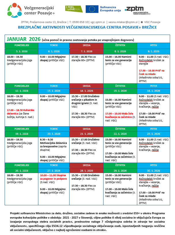 Seveda pa so vam na voljo tudi druge športne, ustvarjalne in družabne vsebine. Tiste, ki jih že poznate iz preteklega leta in nekaj novih (namizni tenis ob četrtkih, razgibavanje za starejše ob torkih dopoldan, družabne igre ob sredah,..) Pokukajte v koledar aktivnosti spodaj in odkrijte več možnosti zase ter spoznajte nove prijatelje.