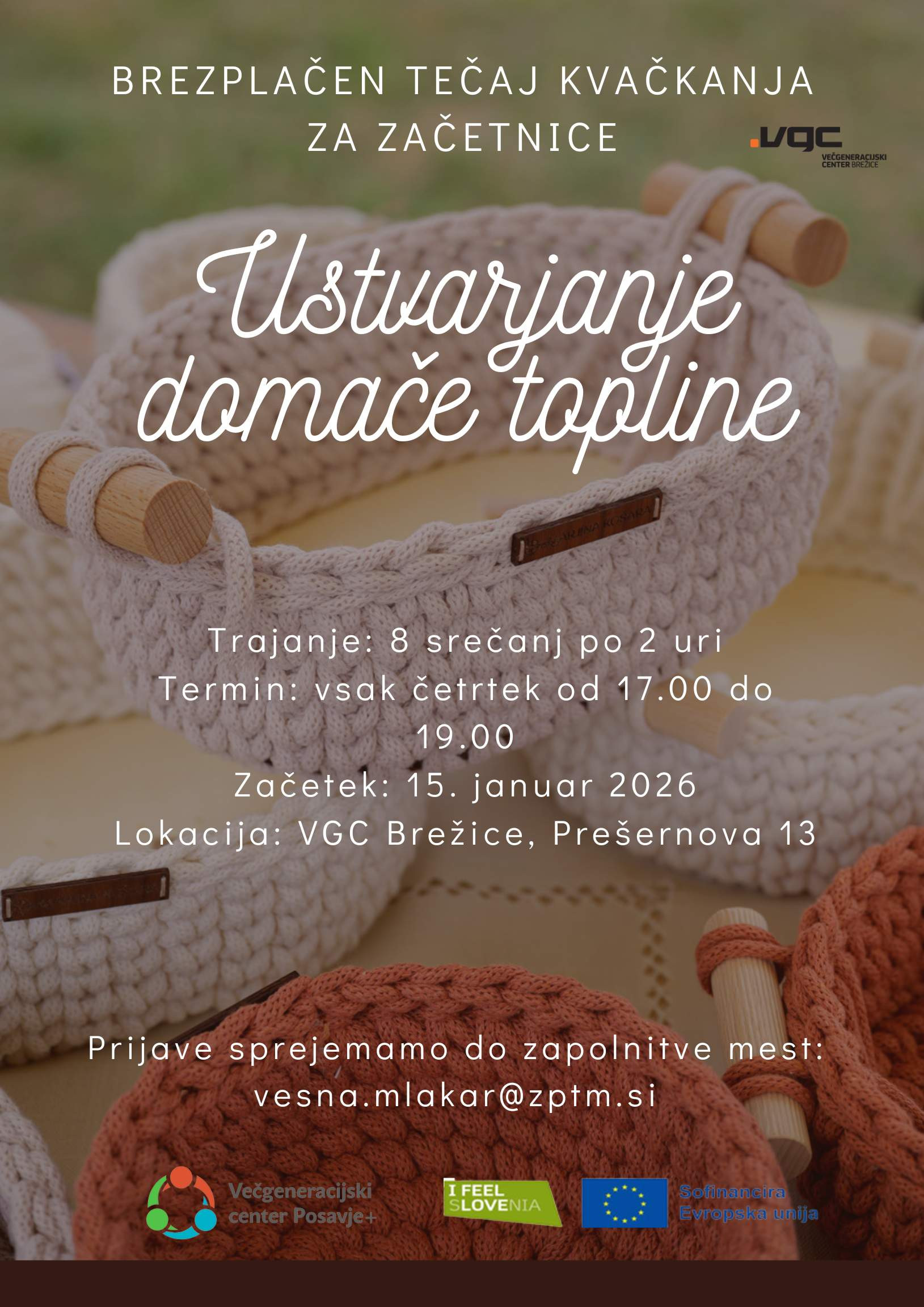 Mala šola kvačkanja za začetnike – začnemo v četrtek, 15.11. 2026 ob 17.00 – 19.00 v VGC Brežice, Prešernova 13 (vodi: Marja Mavsar) Glej vabilo spodaj.